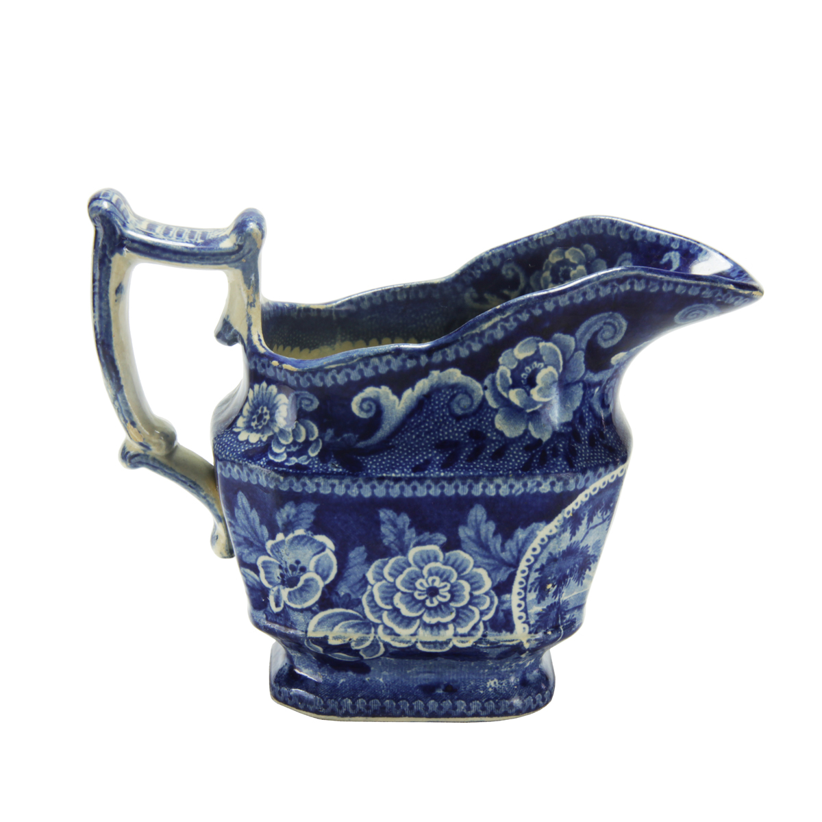 The Church shown on this creamer is similar to one shown on a view called At Richmond, Virginia, so this view has been renamed from Village Church to Virginia Church. It is very likely that Joseph Heath produced this pattern; however, without an identifying mark, the pattern must remain Maker Unknown. Some pieces in this pattern bear an impressed propeller mark, which was used primarily by Heath.