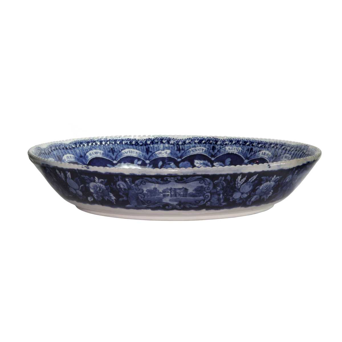 The series to which this bowl belongs is also known as The States Series, as well as The States Border Series, due to the states' names in the border. This form is quite unusual and the earthenware bodies of these large bowls (commonly known as potato bowls by American collectors) are usually heavier and thicker than other serving pieces, it is thought to accommodate the weight of the vegetable. This view is on the exterior of the bowl; the interior shows #02 in the series, Building wih Deer on Lawn. Recent discoveries and the research efforts of author and lecturer Dick Henrywood indicate that the center views in this series are all British. The source prints of these views have led to the specific identification of all the structures, save one. This view is Coghill Hall, Yorkshire, and appears in an article by Dick Henrywood in Ceramics in America 2011, entitled "The States Border Series by Ralph & James Clews", as figure 8 on p. 106.