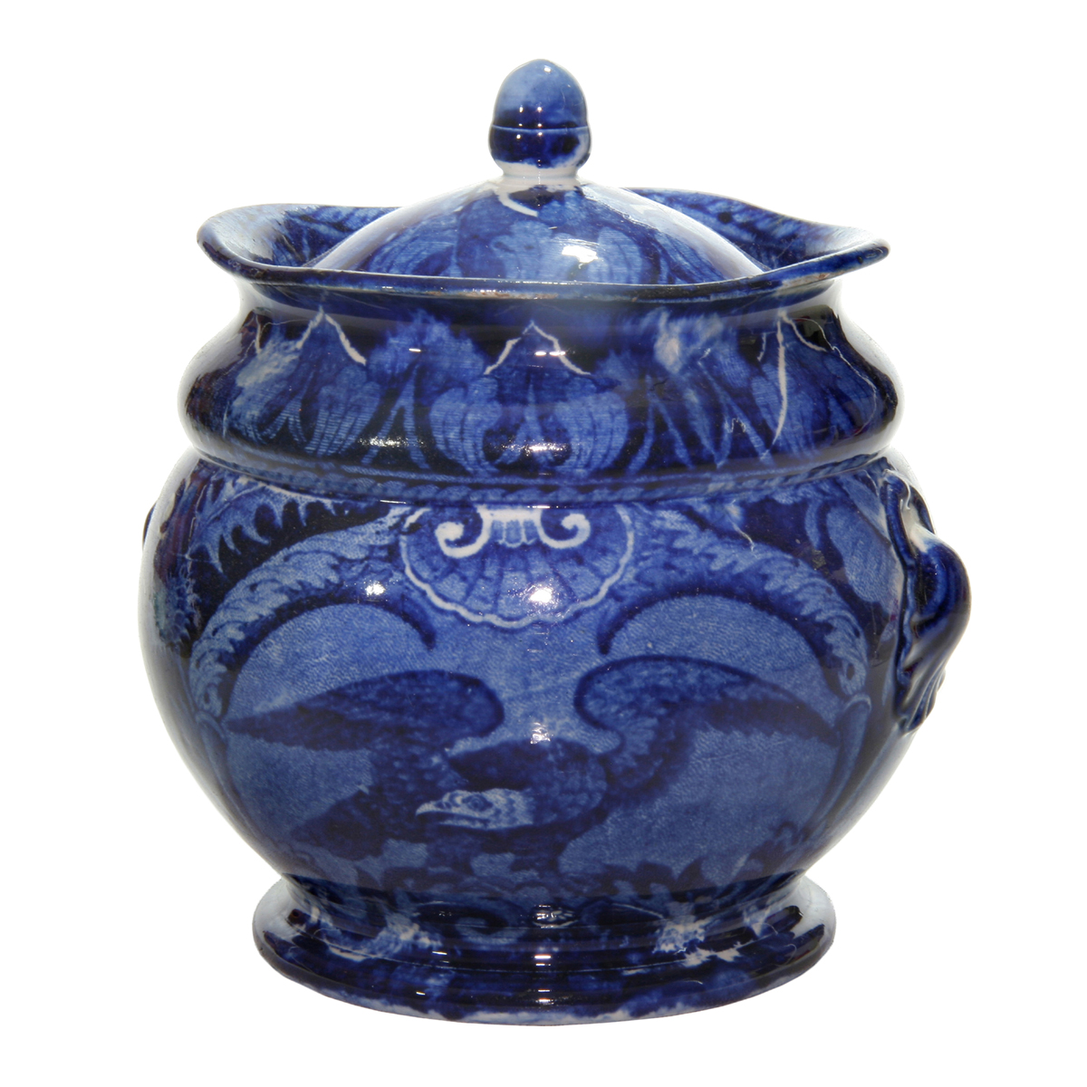 The pattern on this sugar bowl is known either as Bald Eagle or Spread Eagle. The maker is unknown. The border consists of English Thistles, in a flaming projection, and around the Eagle are roses and shamrocks.