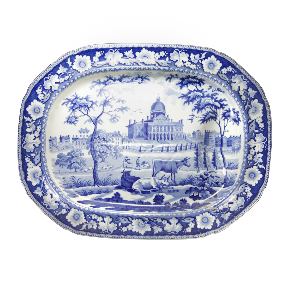 Exhibited here on a platter, this pattern is #01 of three versions of the Boston State House by Rogers. There are five main pattern motifs present in this version. (there are numerous minor differences on others). They are: 1) Two framing trees, 2) Cows, 3) Sheep, 4) Boy with wheelbarrow, and 5) small figures. There are differences in the transfers on some pieces of this pattern by Rogers that show the presence or absence of one or more of these motifs. Examples of these variations are represented in Rogers' Boston State House #02 and #03 in this exhibit. At least 32 different forms with this popular view are known. Stubbs, Stevenson and Enoch Wood (whose version may also be seen in this exhibit) also produced a Boston State House pattern. Built around 1795, the Boston State House was designed by the self-taught architect Charles Bulfinch, who also built state houses for Connecticut (1796) and Maine (1832) based on his design for the Somerset House in London.