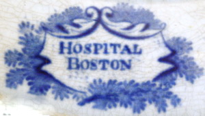 Shown here on a plate, this version of Hospital Boston by Ralph Stevenson & Son, incorporates the portraits of Thomas Jefferson and General Lafayette. (“Welcome Lafayette, The Nation's Guest”). Andrew Stevenson produced a Medallion Portrait series, using English center views and a Wild Rose Border. Medallion Portrait Series was also produced by Stevenson in the Acorn and Oak Leaf Border Series. Most of the portrait plates also have an inserted vignette of the Erie Canal, here, a View of the Aqueduct Bridge at Little Falls. Stevenson's view here was also produced without the medallions, in the same Vine Border and a similar mark except bearing the initials RS. See that version (Hospital Boston #2) in this exhibit under Places. While this is also part of the Vine border series, we have listed it under the Medallion Portrait Series with the other medallion pieces.