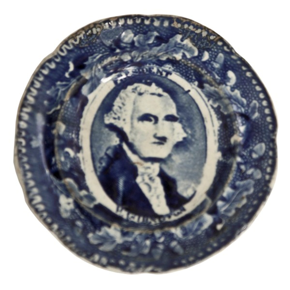 Here is one of the scarcest cup plates in historical Staffordshire. It is made by Ralph Stevenson & Williams from their Acorn and Oak Leaves border series as well as part of the Medallion Portrait series. Note the portrait of Washington is the same as on other Medallion Portrait pieces. References seem to indicate that there is only one known example (in a museum). It also has occurred to some authors that there may be medallion portrait cup plates of the other three popular personages, La Fayette, Clinton and Jefferson, who are seen on multiple image medallion pieces. There also may be small plates that bear this image in the center. This particular plate is a part of the Larson collection housed at the Smithsonian Museum.