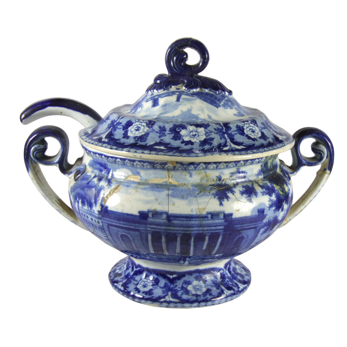 This covered soup tureen, in somewhat disrepair, shows the old Bank in Savannah, Georgia. See the shape representing Exchange, Charleston for an amost identical piece.