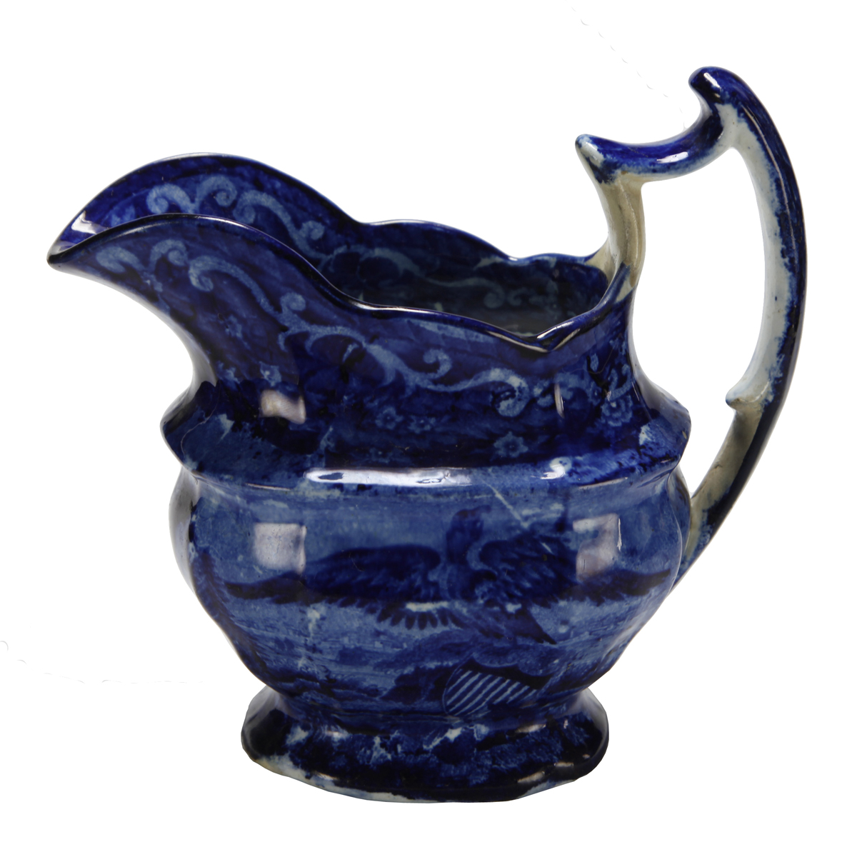The scene on this creamer is the same on both sides. The creamer has a rounded base and shoulder, and a scalloped rim. The handle is angular with a thumb rest and forward spur.