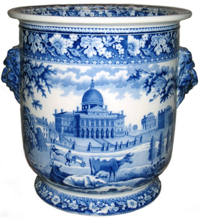 Perhaps one-of-a-kind, this wine cooler shows the Boston State House by Rogers, and the beauty of having the pattern on such a large piece is the detail included in the scene. The handles appear to be Lions' heads. This is version #1 of the three Rogers versions of this scene (see that view in this exhibit under Patterns). Note: All of the Boston State House images in Shapes are of the #1 variety. For the #2 and #3 variety, see Patterns. Boston Common (also known as "the Common") is a central public park in Boston, Massachusetts. It is sometimes erroneously referred to as the "Boston Commons". It is part of the scene on pieces whose central image is of the Boston State House. Dating from 1634, it is the oldest city park in the United States. The Boston Common consists of 50 acres of land bounded by Tremont Street,Park Street, Beacon Street, Charles Street, and Boylston Street. The Boston State House, now known as the Massachusetts State House, stands across Beacon Street from the northern edge of the Common.