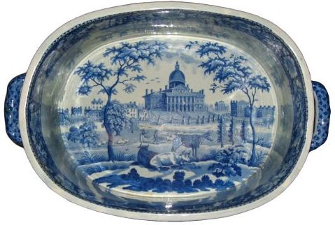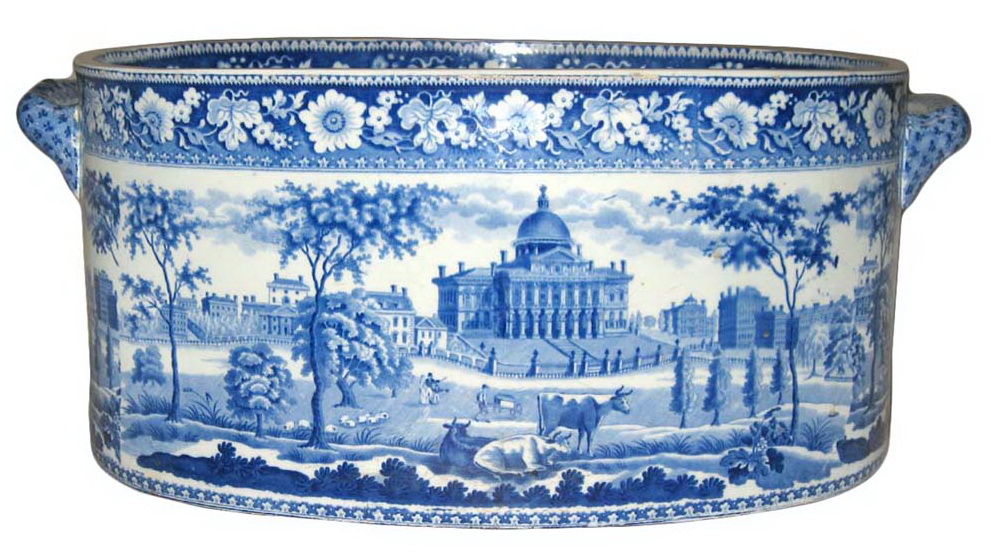 This large container, over a foot and a half wide, is a foot bath, a popular form of the time. It shows version #1 of Rogers' Boston State House, 1) Two framing trees. 2) Cows. 3) Sheep. 4) Boy with wheelbarrow. 5) Small figures. Note: All of the Boston State House images in Shapes are of the #1 variety. For the #2 and #3 variety, see Patterns. Boston Common (also known as "the Common") is a central public park in Boston, Massachusetts. It is sometimes erroneously referred to as the "Boston Commons". It is part of the scene on pieces whose central image is of the Boston State House. Dating from 1634, it is the oldest city park in the United States. The Boston Common consists of 50 acres of land bounded by Tremont Street,Park Street, Beacon Street, Charles Street, and Boylston Street. The Boston State House, now known as the Massachusetts State House, stands across Beacon Street from the northern edge of the Common.