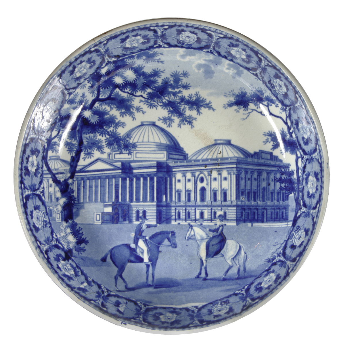 This pattern in the Beauties of America series is found in a number of forms. These include a well and tree platter and regular platter, each measuring 20.5 inches; a drainer, bowl, plaque, bidet, cup and compote. The drainer can also be seen in this exhibit. This serving piece, wide and flat with high straight sides, is often referred to as a potato bowl among American collectors, though it obviously could have been used for a number of purposes.