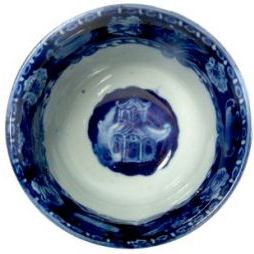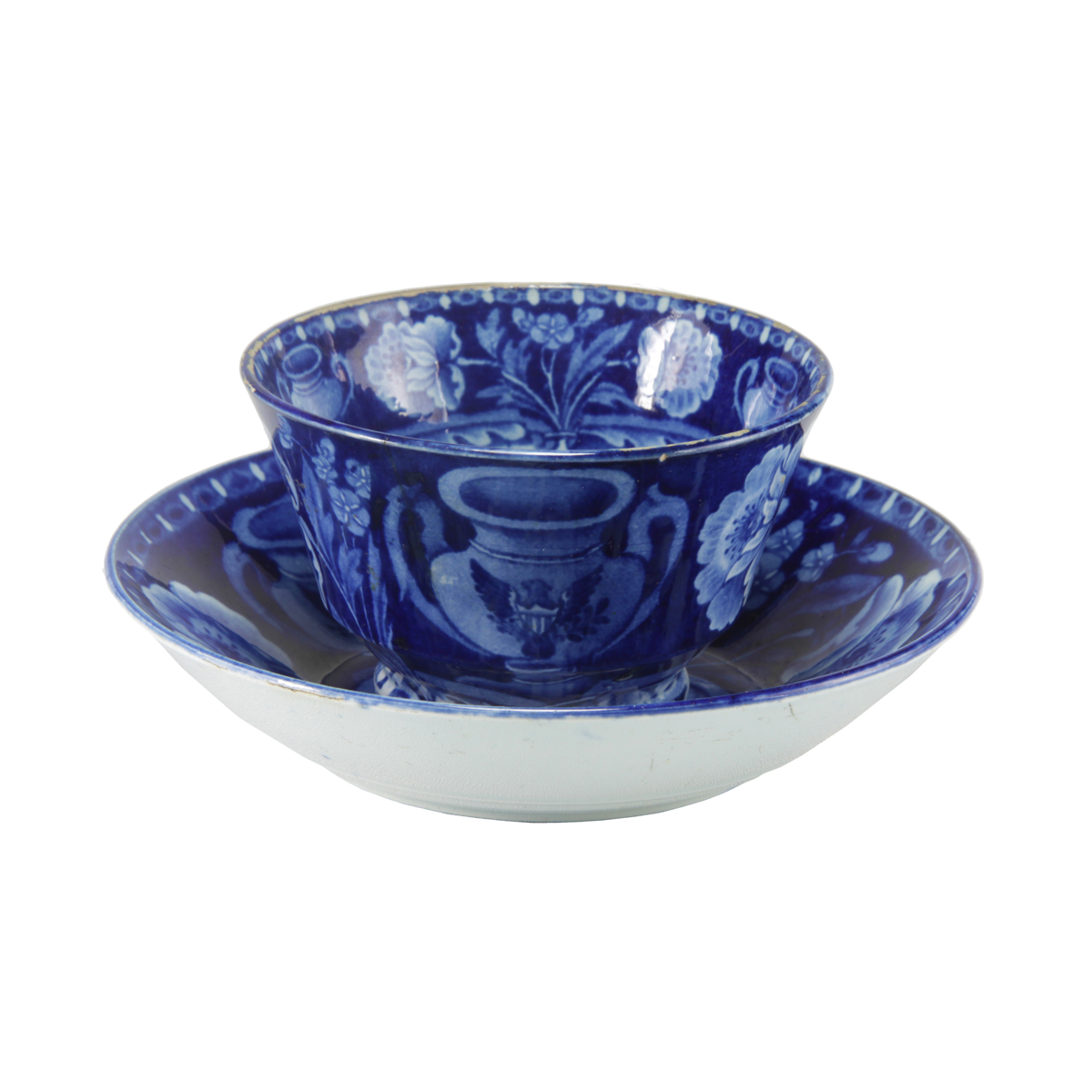 The pattern on this handleless cup and saucer is also known on all the pieces comprising a tea set - teapot, creamer, at least two forms of sugar bowl, and waste bowl. See additional images below.