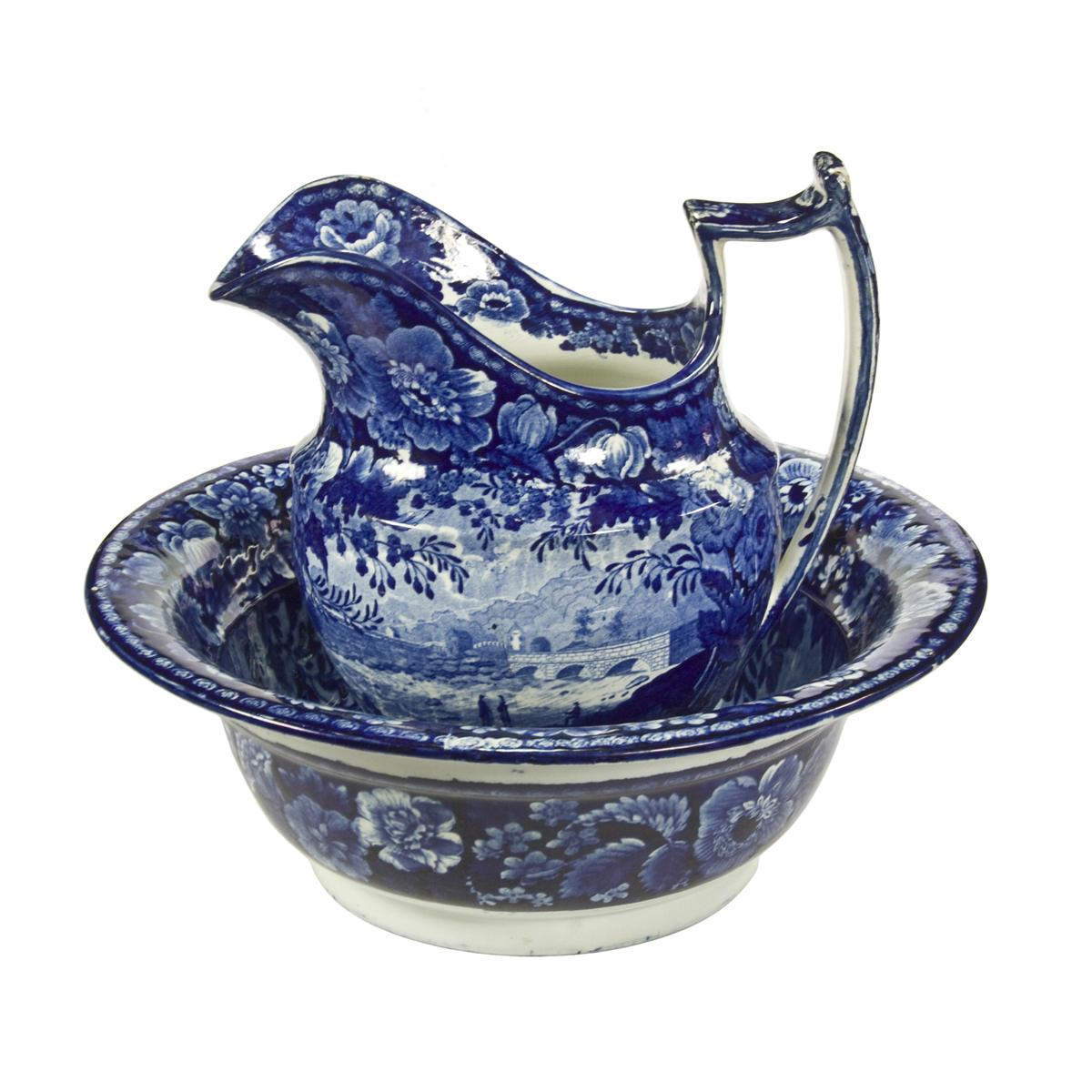 The pattern on this wash pitcher is known on at least five pitcher forms including this one. The others can also be seen in this exhibit. It is also known on a washbowl, and a chamber pot with cover. The proper bowl to this set would have one of the three views of the Erie Canal used by Wood. All three exist in bowl form.