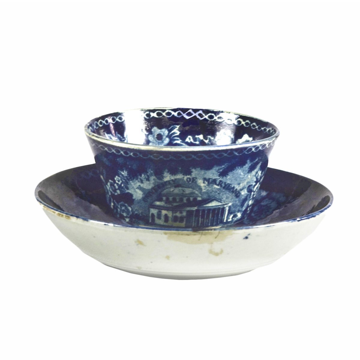 This handleless tea cup bears the border common to six views of Baltimore.The maker is unknown. The name of the scene is printed as part of the design. University of Maryland, Baltimore, (also known as UMB) was founded in 1807. It comprises some of the oldest professional schools in the nation and world.