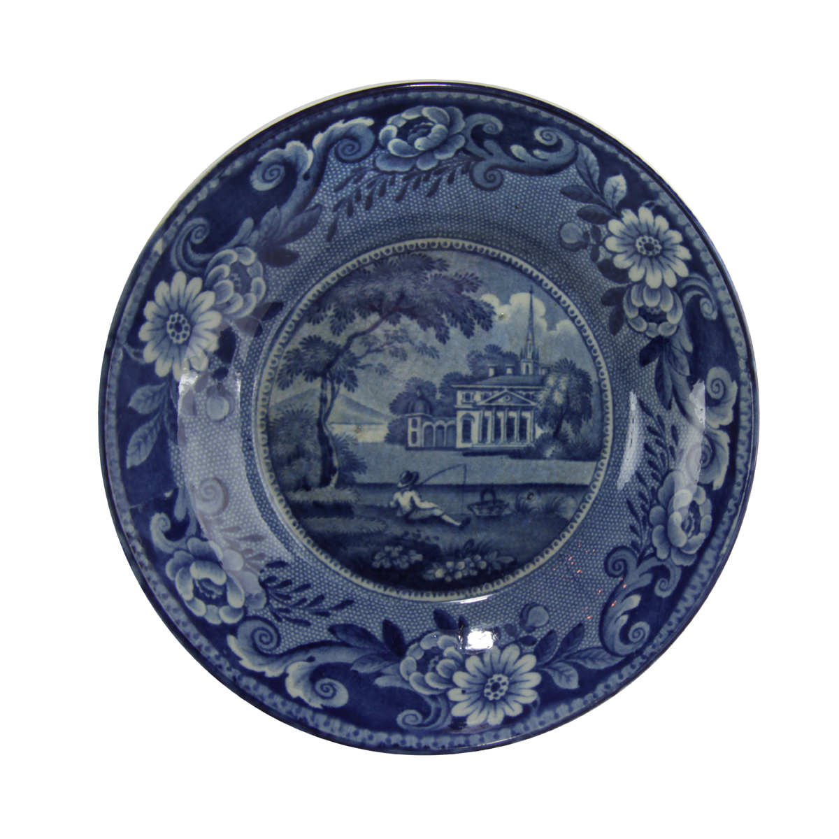 The Church shown on this saucer is similar to one shown on a view called At Richmond, Virginia, so this view has been renamed from Village Church to Virginia Church. It is very likely that Joseph Heath produced this pattern; however, without an identifying mark, the pattern must remain Maker Unknown. Some pieces in this pattern bear a mark known as a propeller, which was used primarily by Heath.