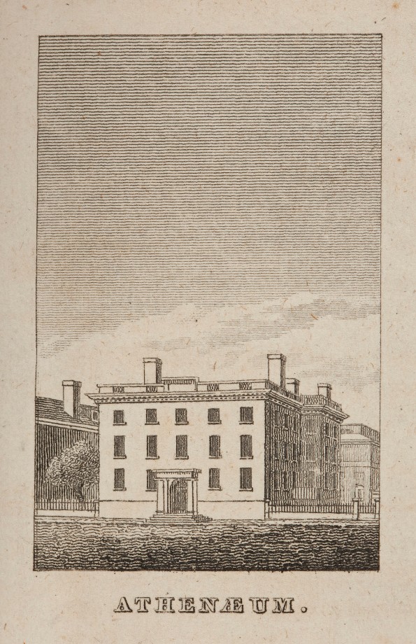 Originally planned as a public reading room with reference and both domestic and international periodicals available to its subscribers, the Boston Athenaeum remains a prominent Boston institution. It has had four homes over its two hundred and four year history, including Congress Street, Common Street (1810), Pearl Street (1822) and 10 1/2 Beacon Street (1849). This view is of its Pearl Street location, the home of Athenaeum trustee (and Boston merchant) James Perkins. Perkins offered his home to the society when it outgrew its Common Street location.