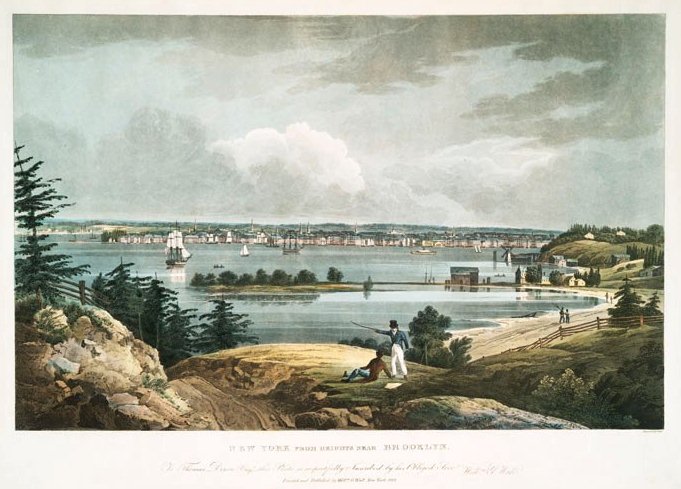 The view was made from a point in Brooklyn near the Anchor Gin Distillery of Hezekiah Beers Pierrepont, looking across Manhattan to the New Jersey Hills.