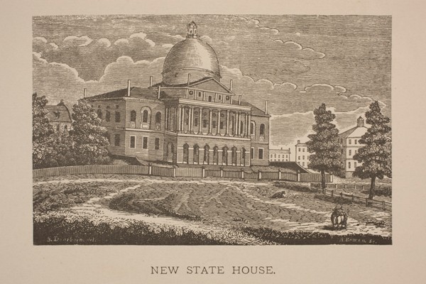 The New State House in Boston was one of several New England state houses designed by Charles Bulfinch. It earned its name when it became the new home of the government in 1798, three years after Samuel Adams laid its cornerstone, when it moved out of the offices that had served since 1713. For his State House in Boston, Bulfinch drew on design inspirations from his study of London architecture, specifically William Chambers' Somerset House and James Wyatt's Pantheon. The dome was originally covered in wood shingles, later replaced by copper sheathing by Paul Revere's company in 1802, finally coated in gold leaf in 1874. Charles Brigham oversaw the addition of east and west wings to the structure in 1895. Bulfinch built on part of Beacon Hill, on land once owned by John Hancock (signer of the Declaration of Independence), whose house stands just to the left of it in early images. A great 1815 storm damaged the first Common fence, built in 1784, which required extensive mending from 1815 to 1820. Cows were allowed to graze on the Boston Common at the foot of Beacon Hill from its inception until they were banned in 1830. Print Source: