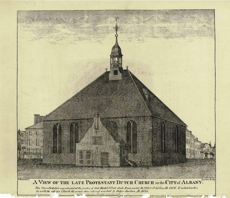 Engraved c. 1806, by Henry W. Snyder after a drawing by Philip Hooker Engraving inscribed, bottom left P. Hooker Delt. bottom right Snyder Sculp., and beneath the title, The Venerable Edifice was situated at the junction of Stock Market & Court streets. It was erected A.D. 1715 & Pulled down A.D. 1806. It included within its walls, the site of a Church the corner stone whereof was laid by Rutger Jacobson A.D. 1656