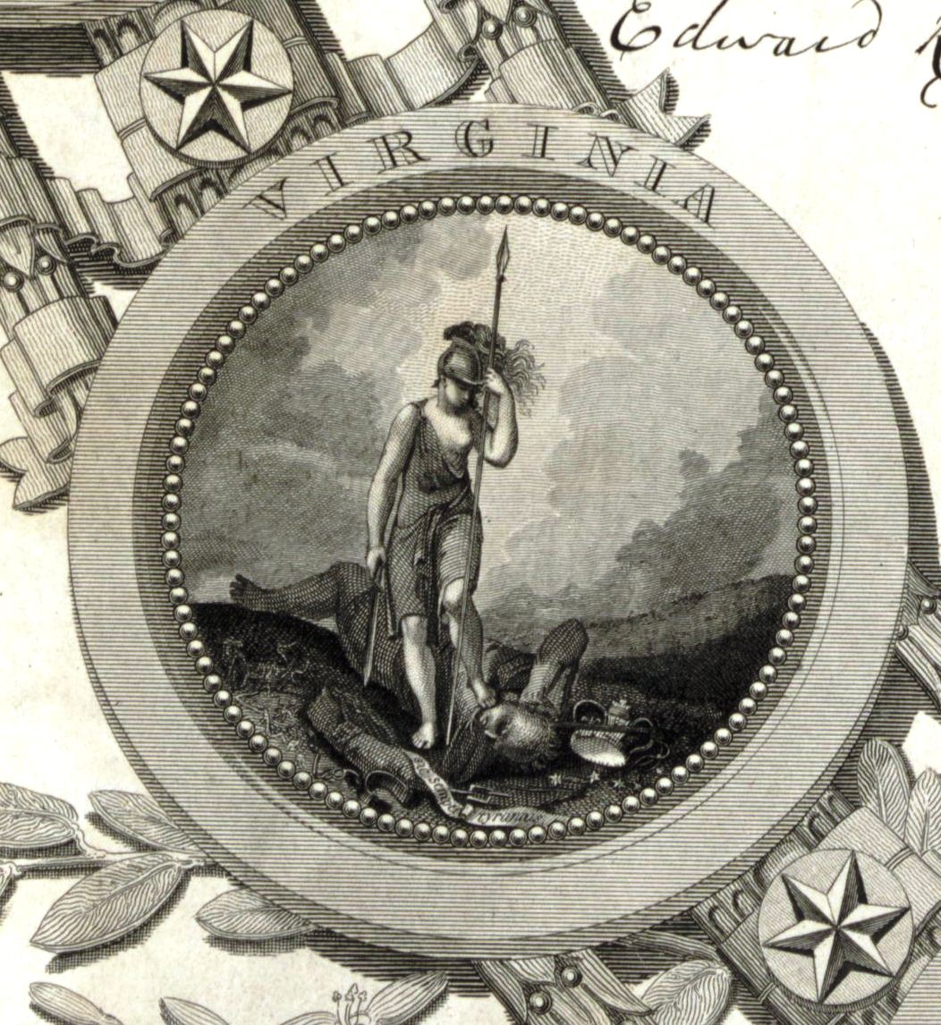 The Commonwealth of Virginia has no official Coat-of-arms, but uses imagery from its great seal. The engraving seen here is based on the front or obverse, which is officially described as "Virtus the genius of the Commonwealth", dressed as an Amazon, resting on a spear in her right hand, point downward, touching the earth; and holding in her left hand, a sheathed sword, or parazonium, pointing upward; her head erect and face upturned; her left foot on the form of Tyranny represented by the prostrate body of a man, with his head to her left, his fallen crown nearby, a broken chain in his left hand, and a scourge in his right. Above the group and within the border conforming therewith, shall be the word Virginia, and, in the space below, on a curved line, shall be the motto, Sic Semper Tyrannis." In this case the motto is inscribed on a ribbon at the foot of Virtus, and translated means, Thus Always to Tyrants.
